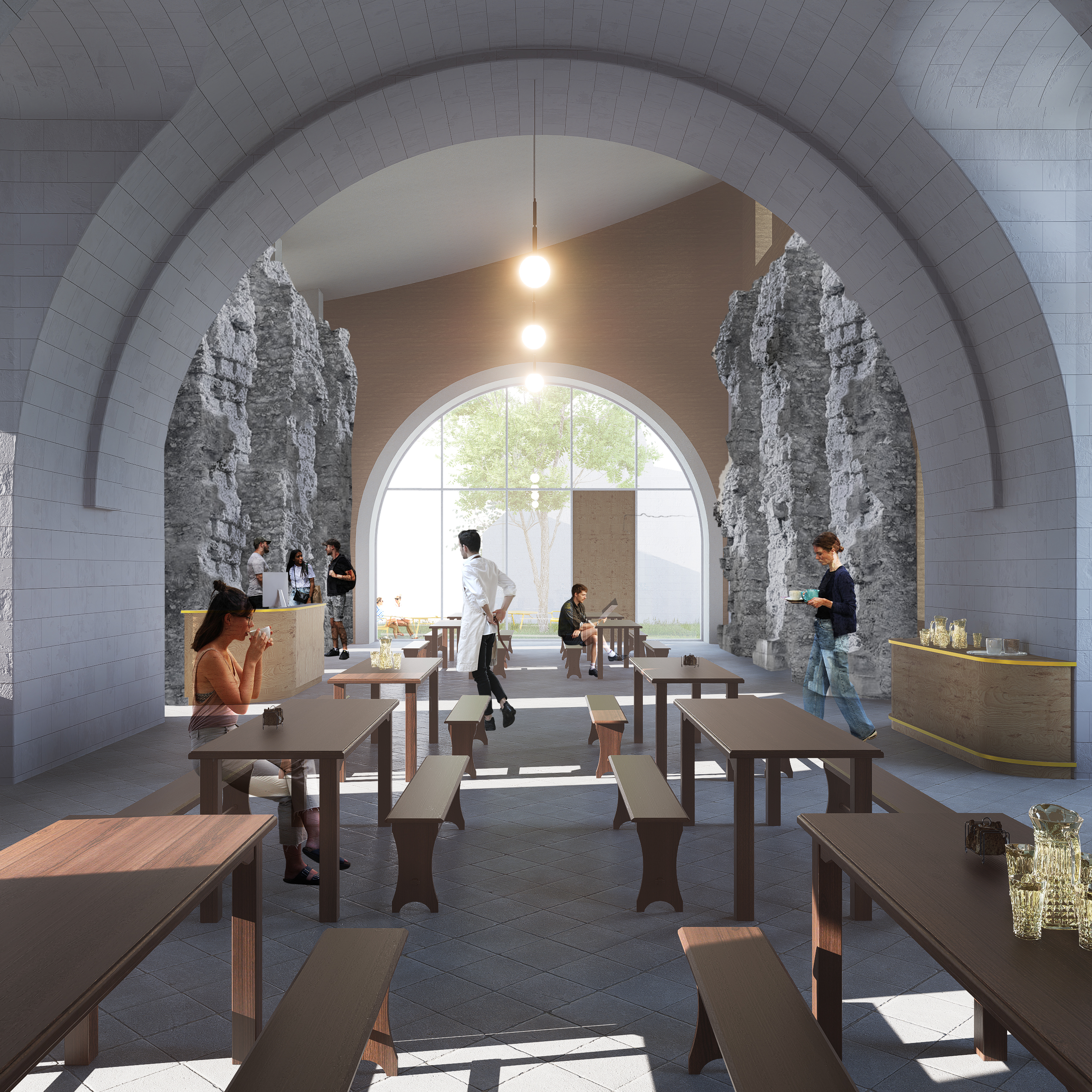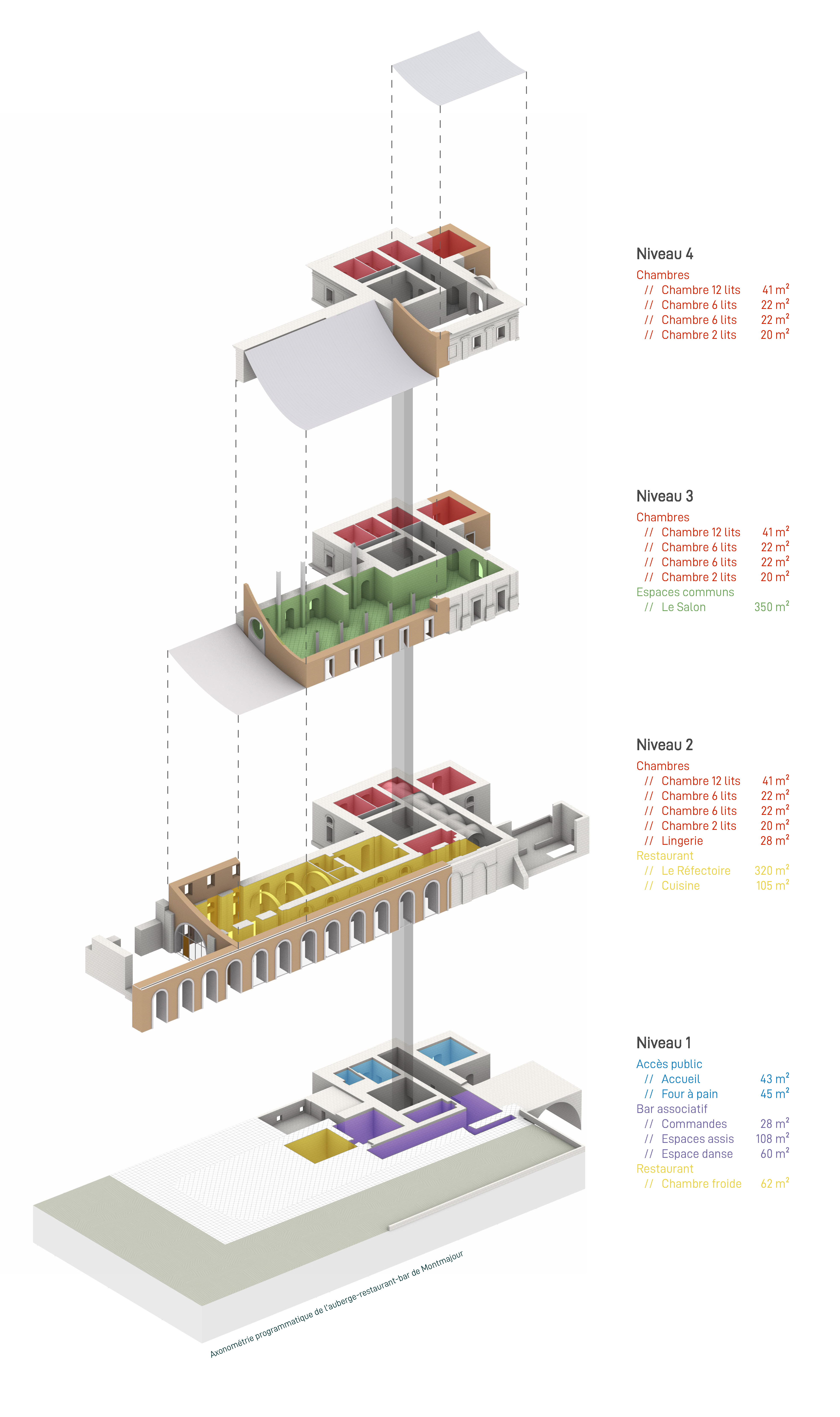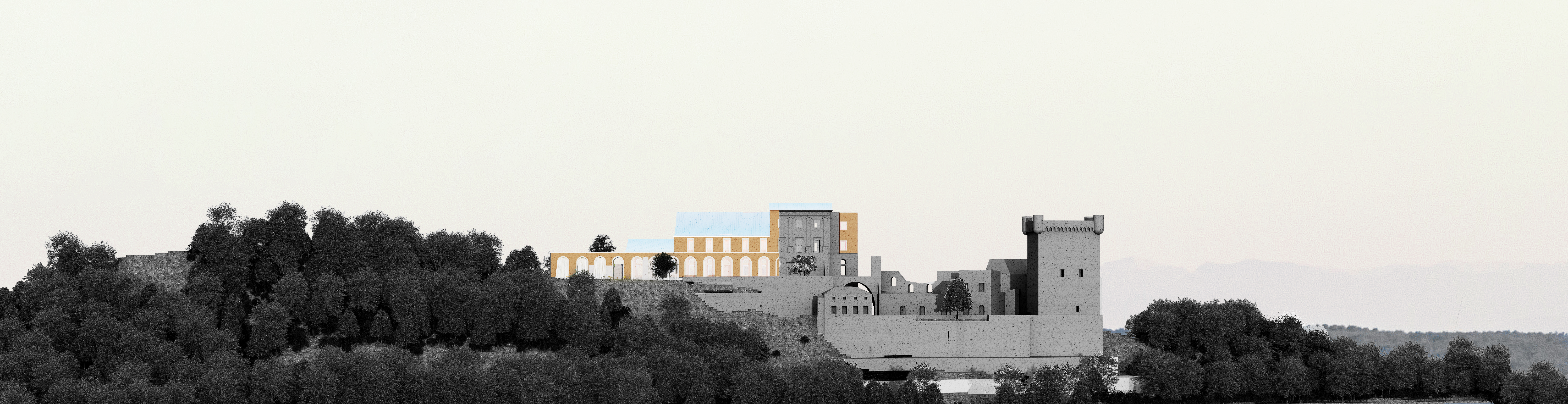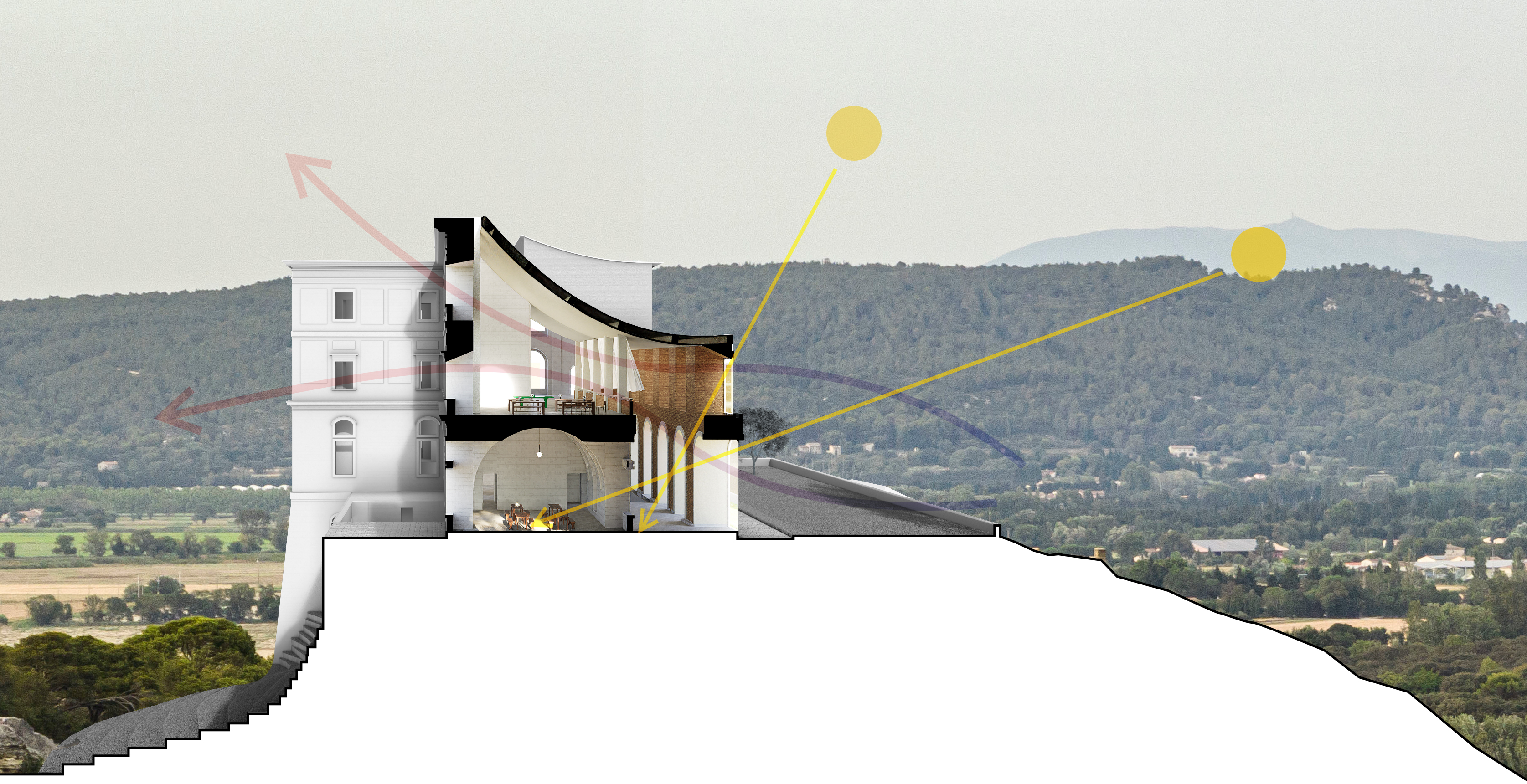 Le parti pris pour l’extension est de s’ancrer dans les éléments existants, au travers d’un discours se voulant provocateur et considérant que le patrimoine ne doit pas nécessairement être vu comme une structure figée et intouchable qu’il faudrait systématiquement muséifier. Il peut être, au contraire, un élément vivant, généreux et capable qu’il convient de réinterpréter et d’intégrer à de nouveaux enjeux, qu’ils soient programmatiques ou bioclimatiques.