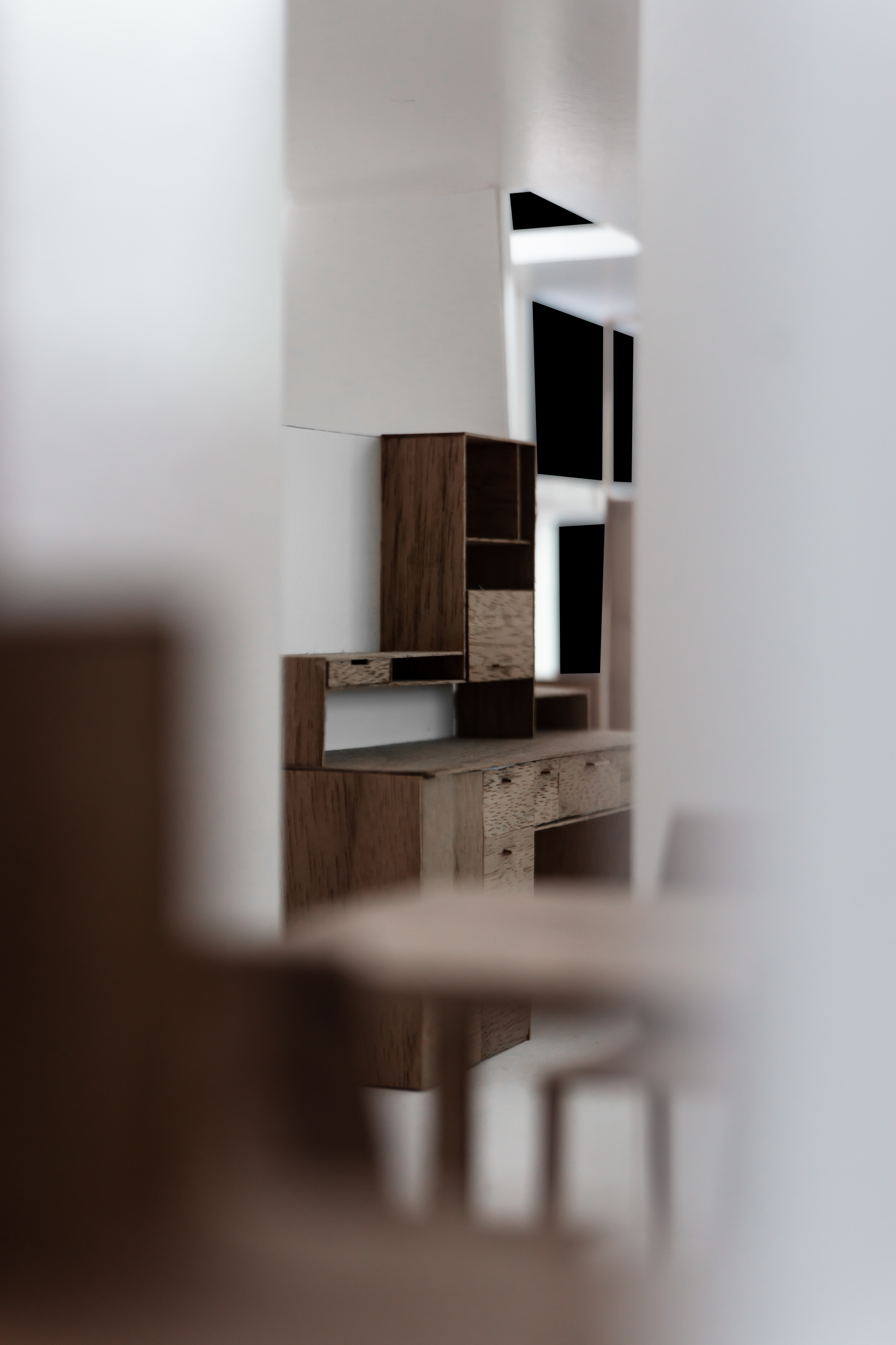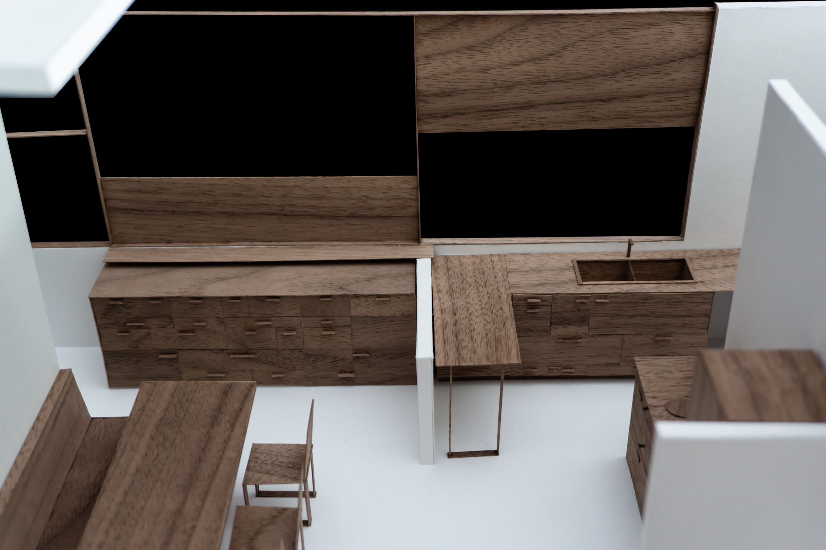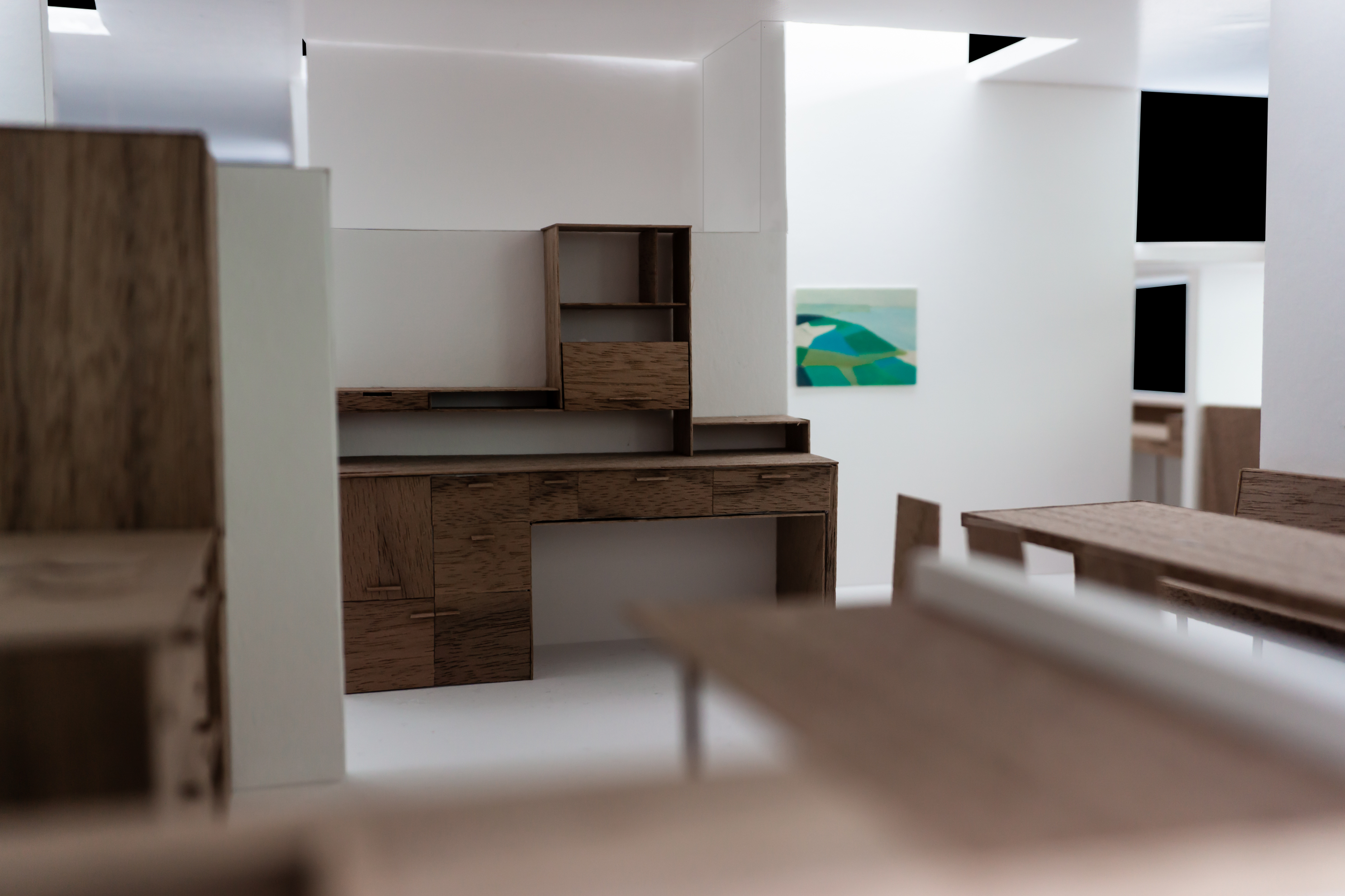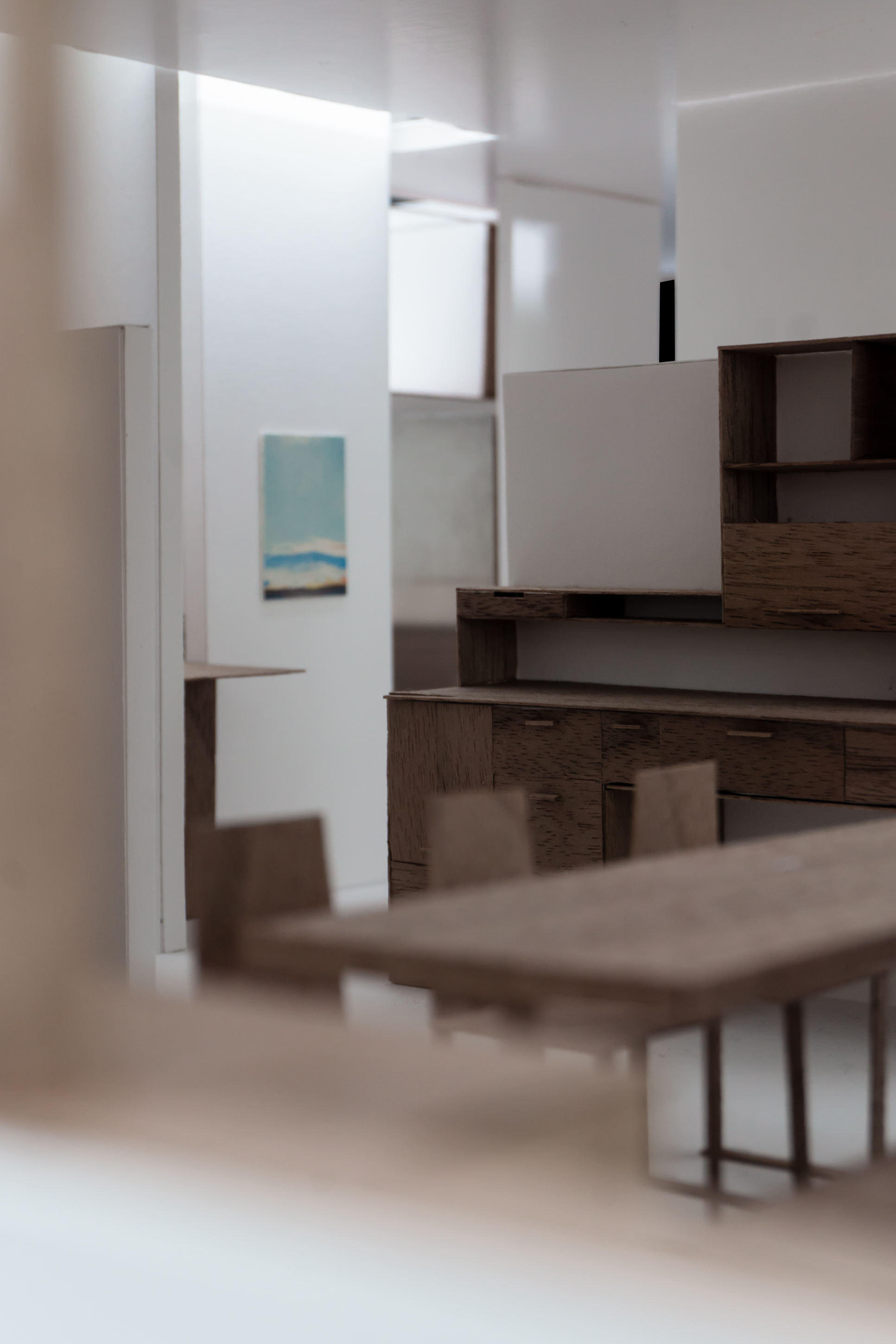 Le projet répond au programme en créant deux grands axes de circulations desservant l’ensemble des espaces. Chaque espace est habité par un mobilier périphérique. Ce “paysage” mobilier travail avec les parois pour dessiner les limites de chaque espace sans pour autant l’isoler du reste du logement.