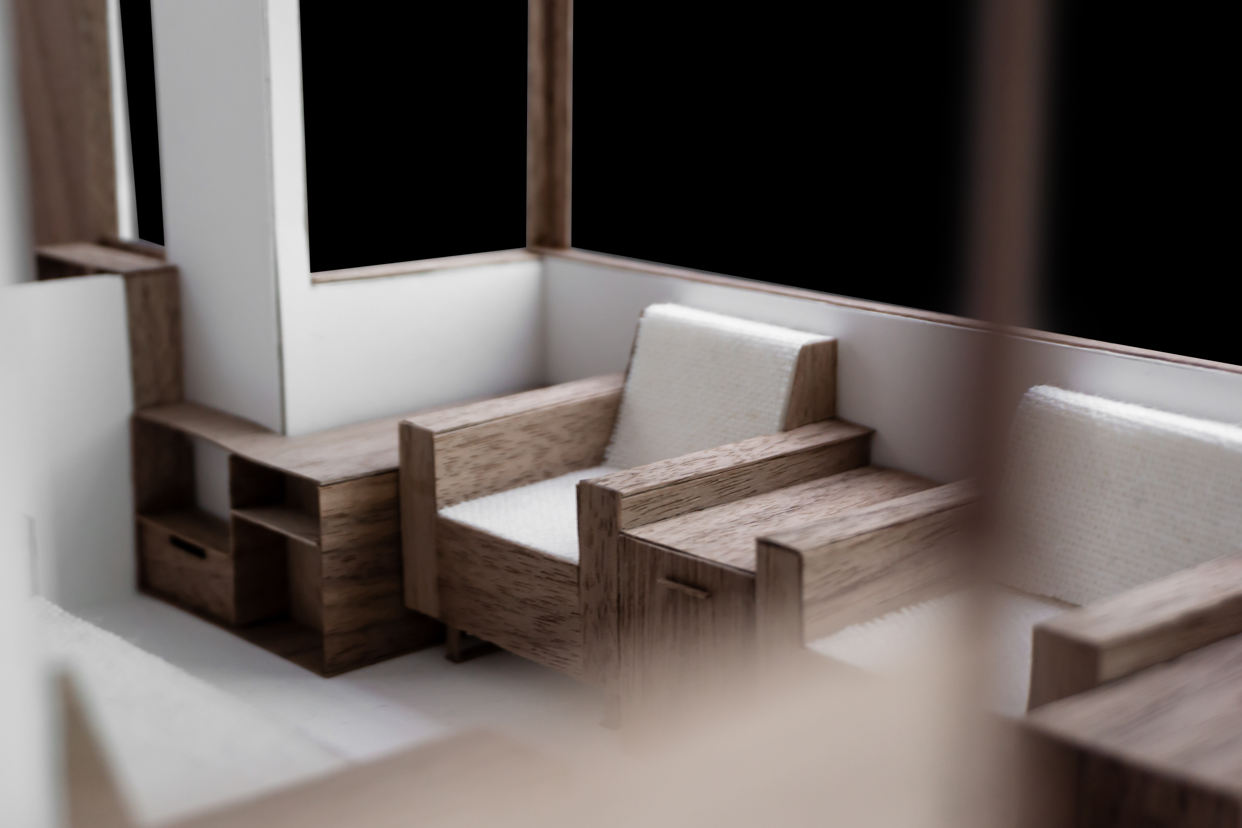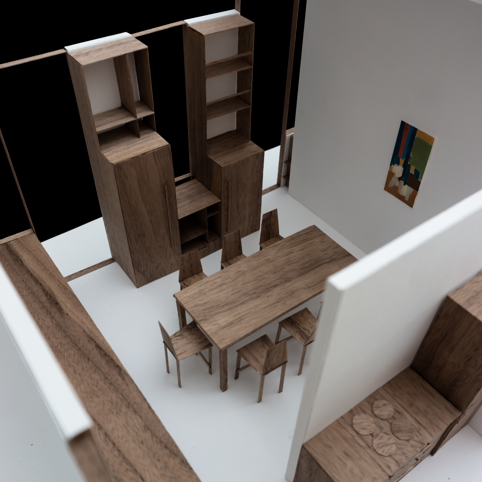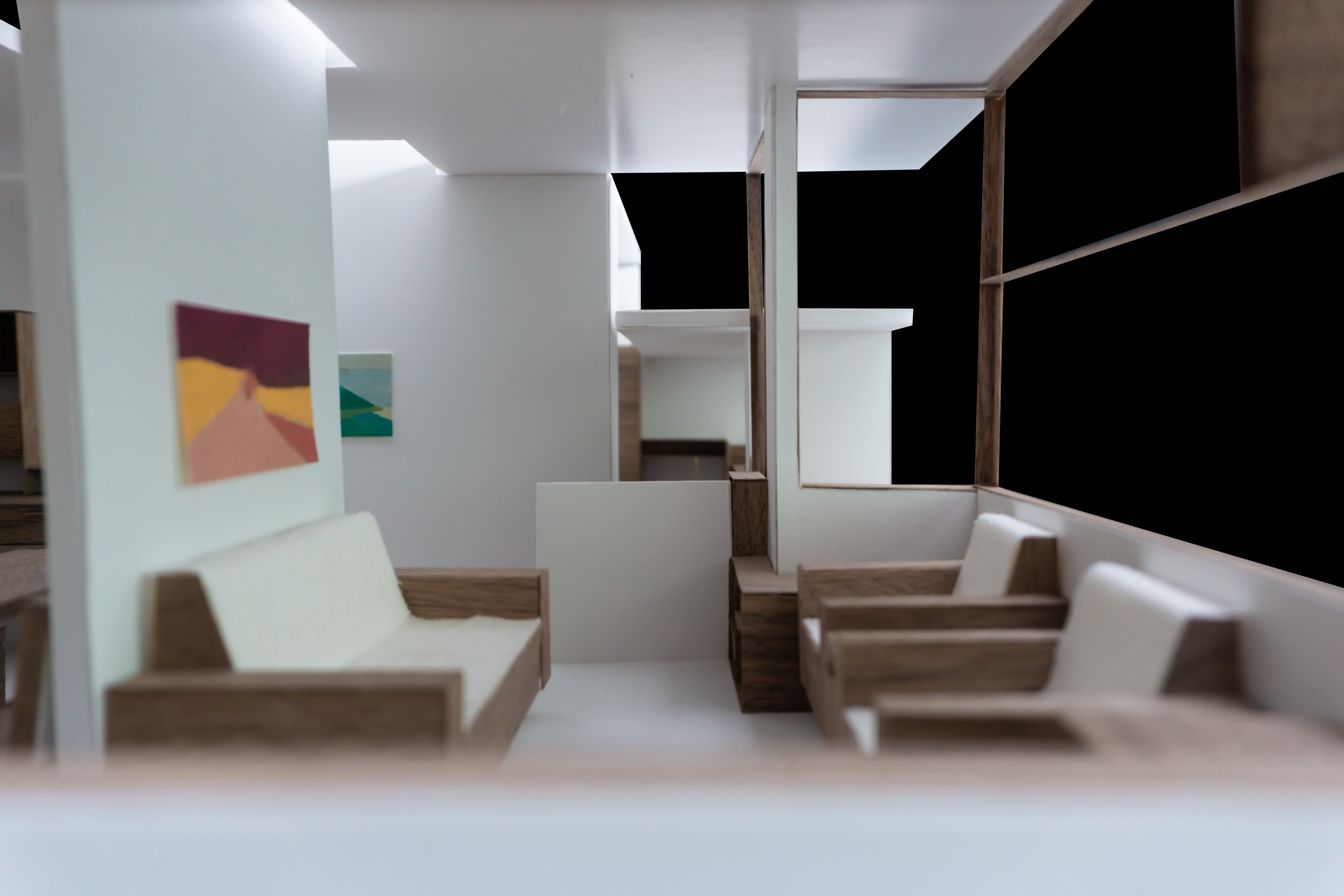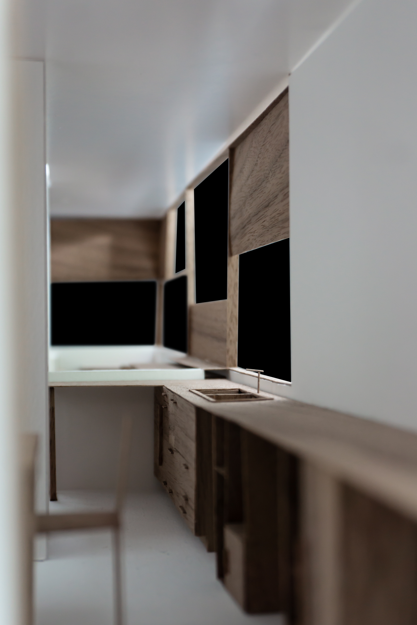 Le projet répond au programme en créant deux grands axes de circulations desservant l’ensemble des espaces. Chaque espace est habité par un mobilier périphérique. Ce “paysage” mobilier travail avec les parois pour dessiner les limites de chaque espace sans pour autant l’isoler du reste du logement.