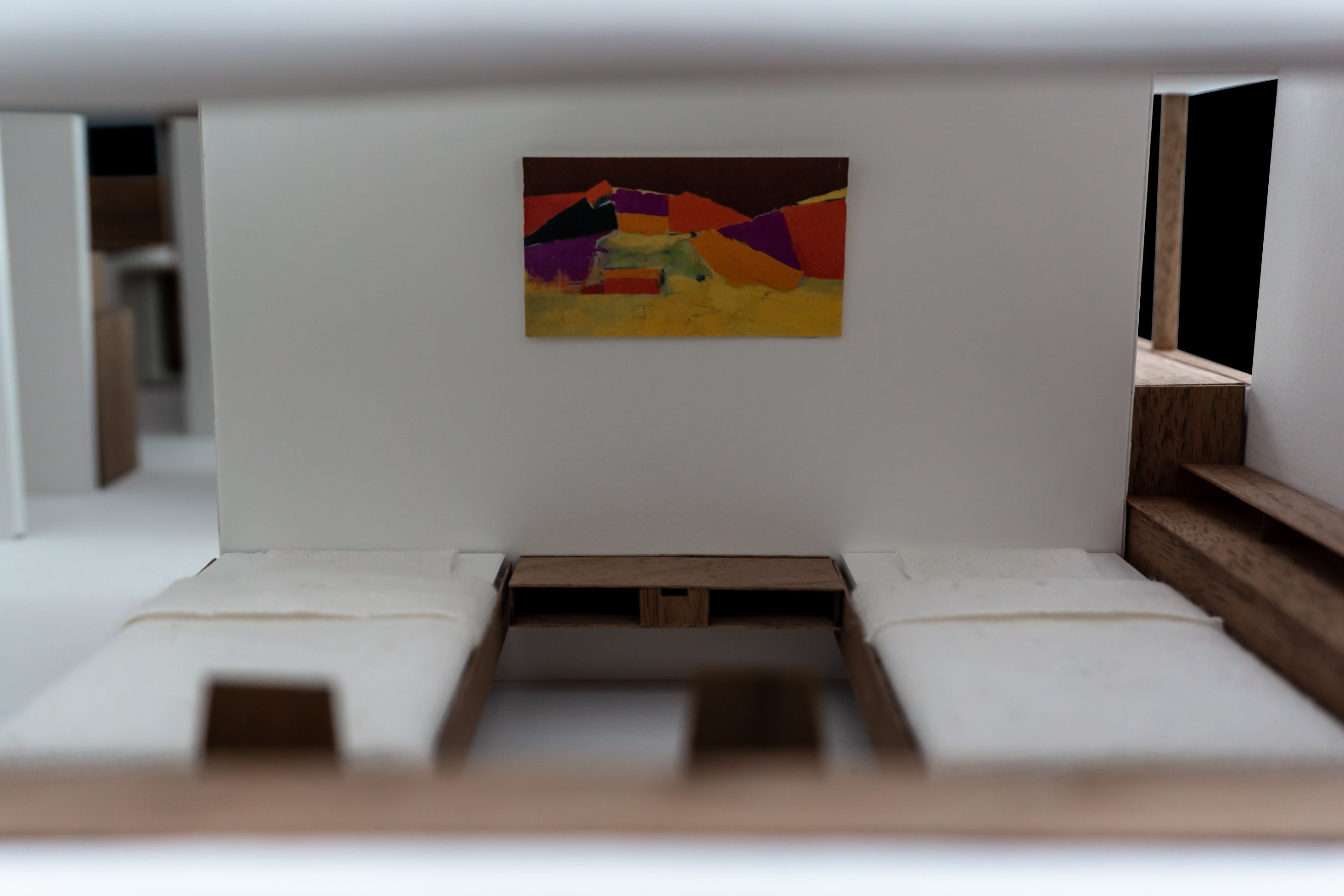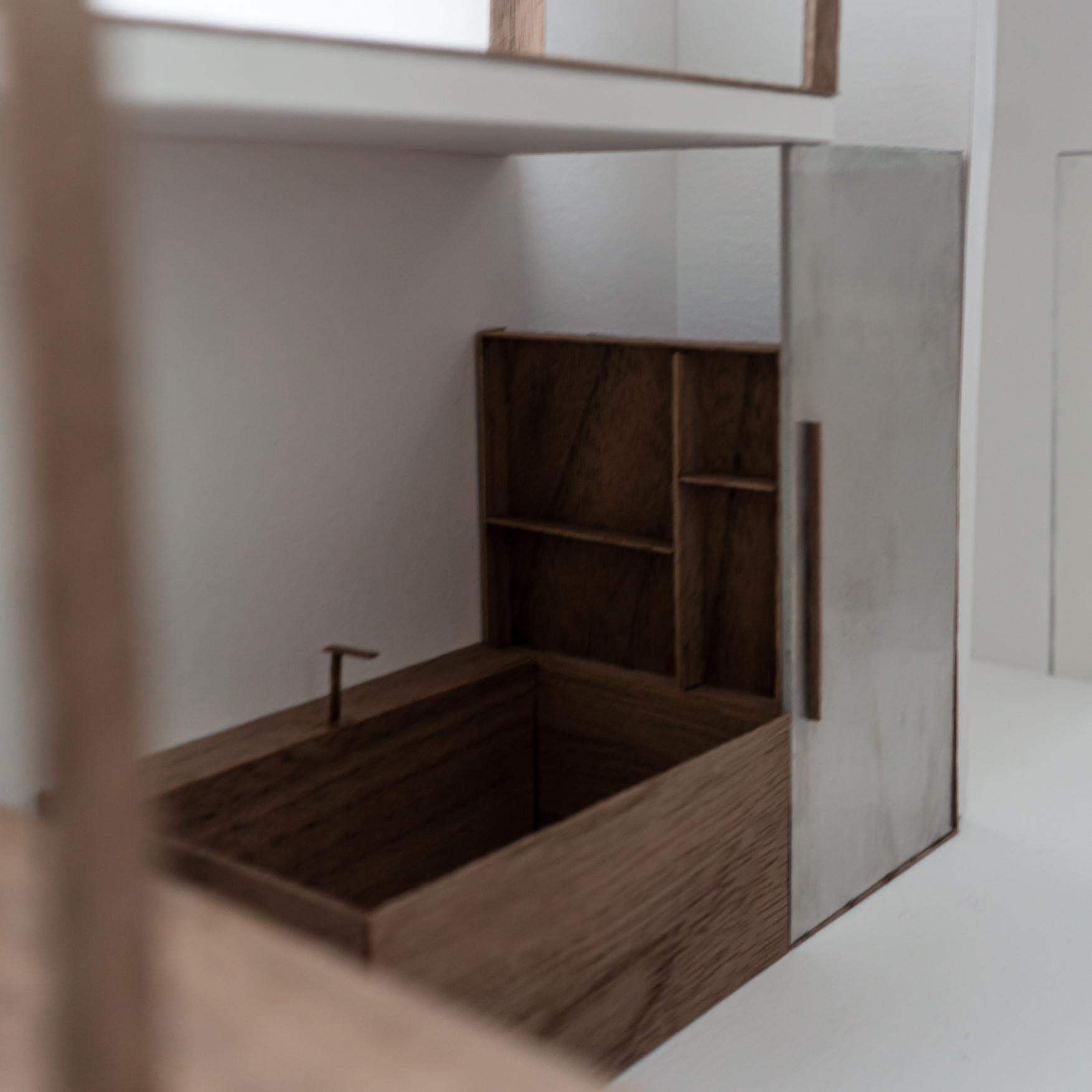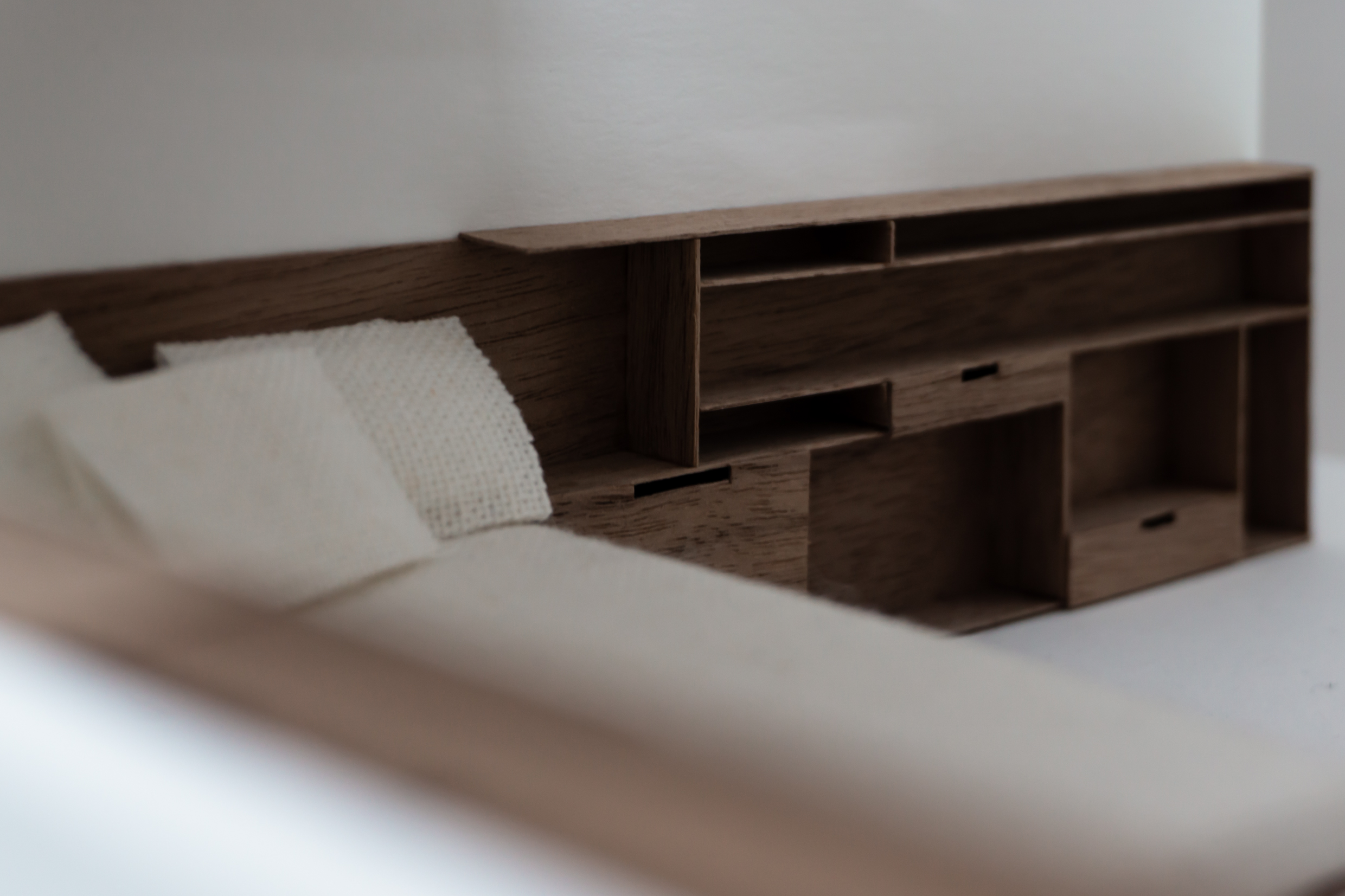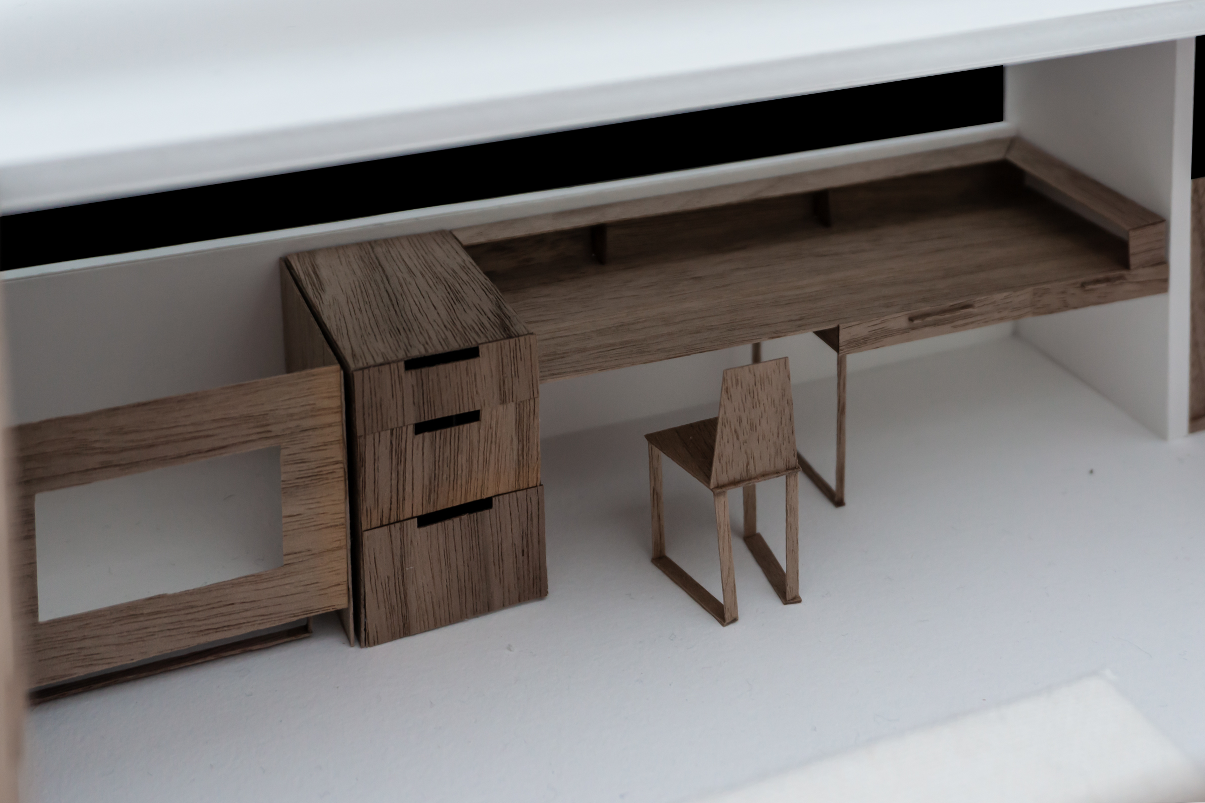 Le projet répond au programme en créant deux grands axes de circulations desservant l’ensemble des espaces. Chaque espace est habité par un mobilier périphérique. Ce “paysage” mobilier travail avec les parois pour dessiner les limites de chaque espace sans pour autant l’isoler du reste du logement.