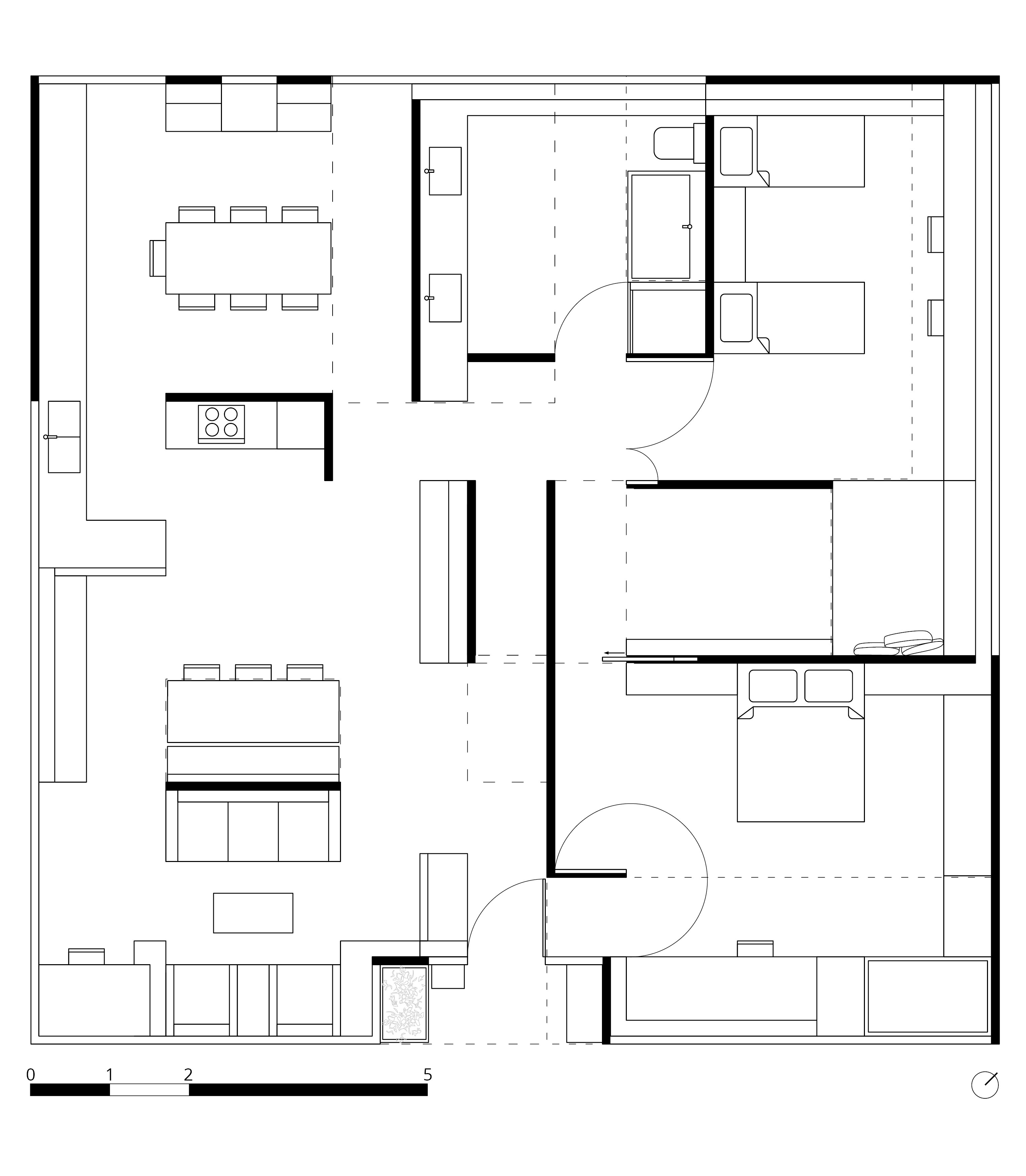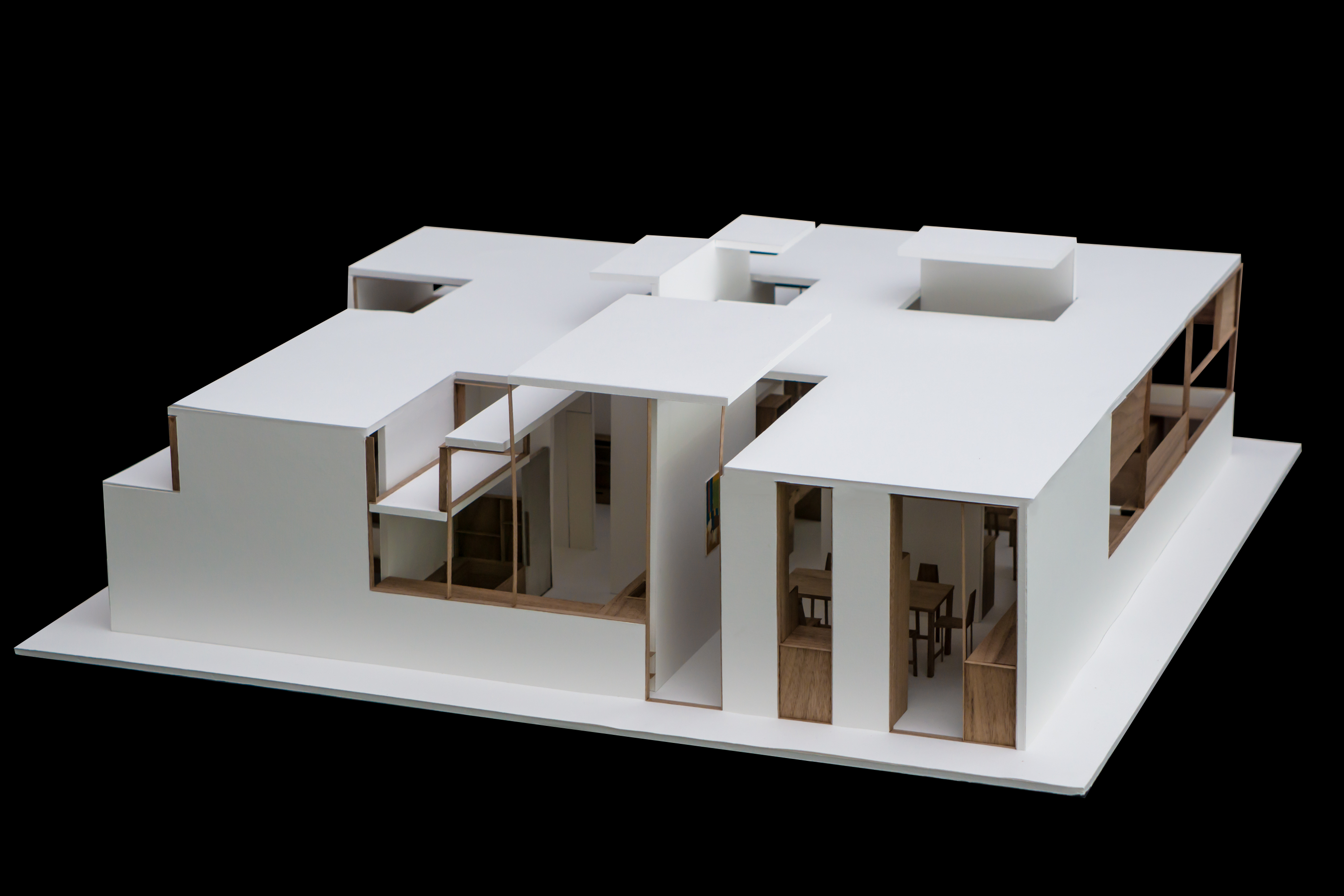 Logement de 11 m x 11 m incluant un espace d’œnologie et un espace de lecture. Le jeu des parois et du mobilier génère des dilatations spatiales et des porosités qui permettent une mise en relation de chaque espace.